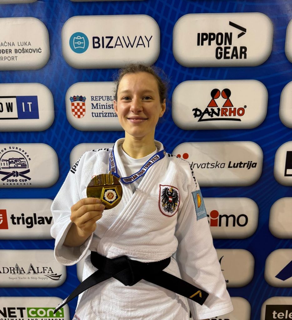 … und jetzt zeigte sie beeindruckend auf – entschied 5 Kämpfe (!!) für sich und krönte sich somit erstmalig zur Europacup Siegerin -57kg in der AK (‚Allgemeinen Klasse‘)! Aber der Reihe nach… In der 1. Runde bezwang sie Donne Breytenbach (RSA/Südafrika) mit Ippon, danach Dibara Salkarbek Kizi (SRB) mit Yuko sowie Chloe Deversain (FRA) mit Hansokumake (‚rote Karte‘) nach bereits einer Yuko-Führung. Im Semifinale setzte sich Laura gegen Noemi Varadi (HUN) knapp mit 2:1 Yuko-Wertungen durch. Das Finale gegen Laura Igaz (HUN) ging in den Golden Score, wo Laura immer mehr dominierte und schlussendlich mit einem Festhaltegriff als Siegerin feststand.
